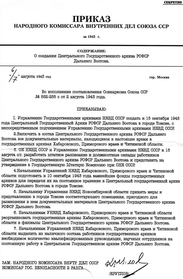 Второго августа 2013 года исполняется ровно 70 лет с момента образования Центрального государственного архива РСФСР Дальнего Востока, который был создан постановлением Совета народных комиссаров СССР 2 августа 1943 года в Томске.